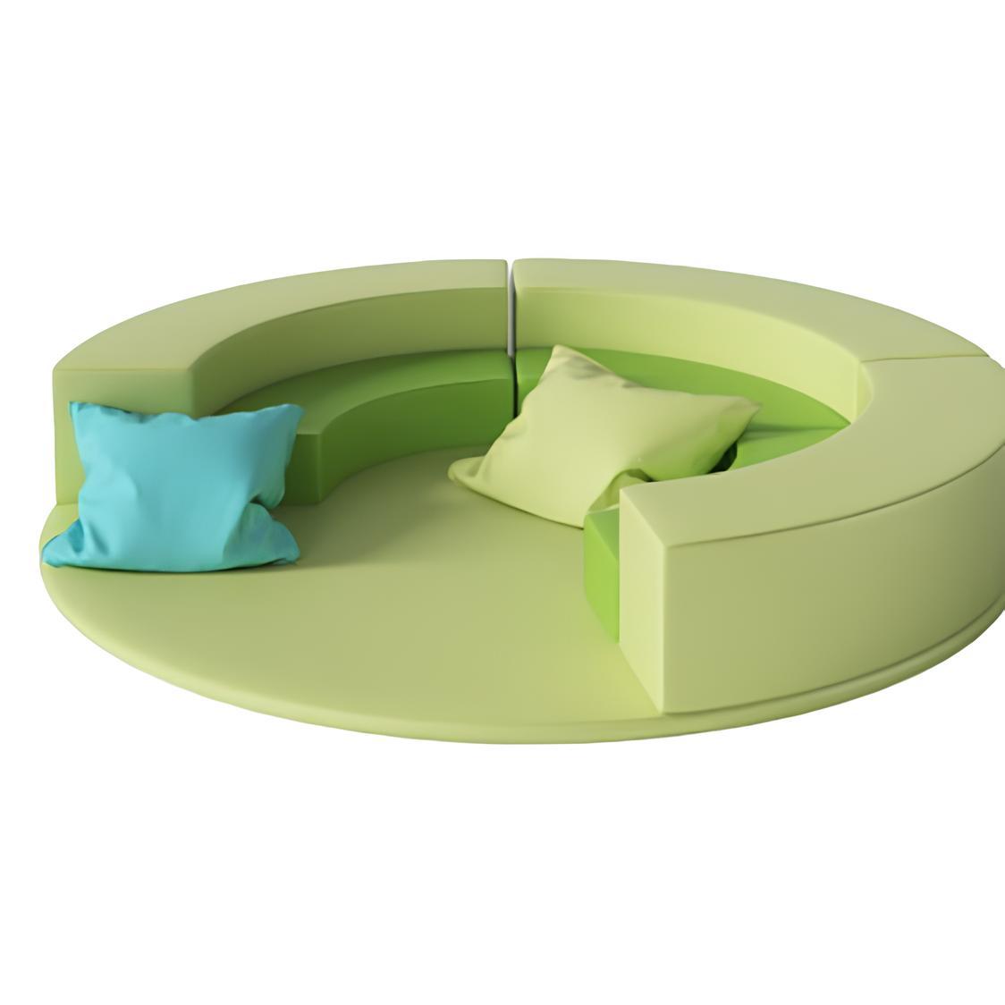 Composizione costruita con tappeto tondo diametro 200 cm, 3 morbidi curvi aventi misure 140x30x30h (morbidi esterni), 3 morbidi curvi aventi misure 90x25x15h (morbidi interni). Classe ignifuga 1. I morbidi vengono realizzati con rivestimento ignifugo classe 1, con imbottitura in poliuretano espanso prodotto in Italia, con densità variabile in funzione delle caratteristiche del singolo articolo. Sono tutti sfoderabili e chiusi con lampo protetta da tasca. Il rivestimento è antibatterico e facilmente lavabile con detergenti neutri.
