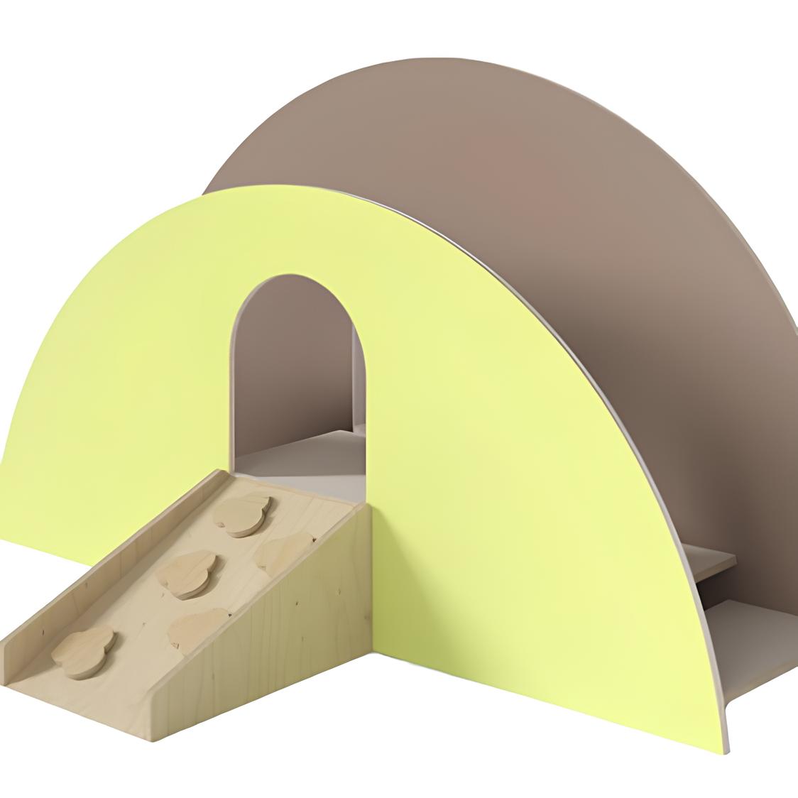 Macrostruttura formata da un elemento scaletta-ponte ed un elemento scivolo con isole per arrampicata. Struttura in legno multistrati di betulla spessore mm. 18 controplaccata ambo i lati in laminato plasticospessore mm. 0.9 per uno spessore totale di ca. 20mm. Il sistema di assemblaggio avviene con spine in legno, eccentrici in metallo ed in plastica. Bordi a vista arrotondati a raggiatura antiinfortunistica e verniciati al naturale.
